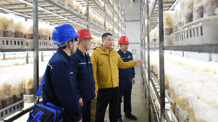 图为国网福州供电公司工作人员在罗源县绣球菌示范推广基地了解菌菇生产情况及培育用电需求。(受访单位供图)