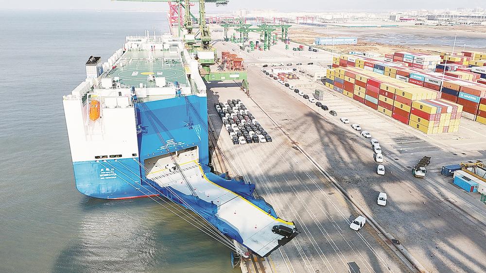 图为靠泊江阴港区的“贞观口”轮在进行装载汽车作业。(记者 陈欢欢 通讯员 薛有雄 摄影报道)