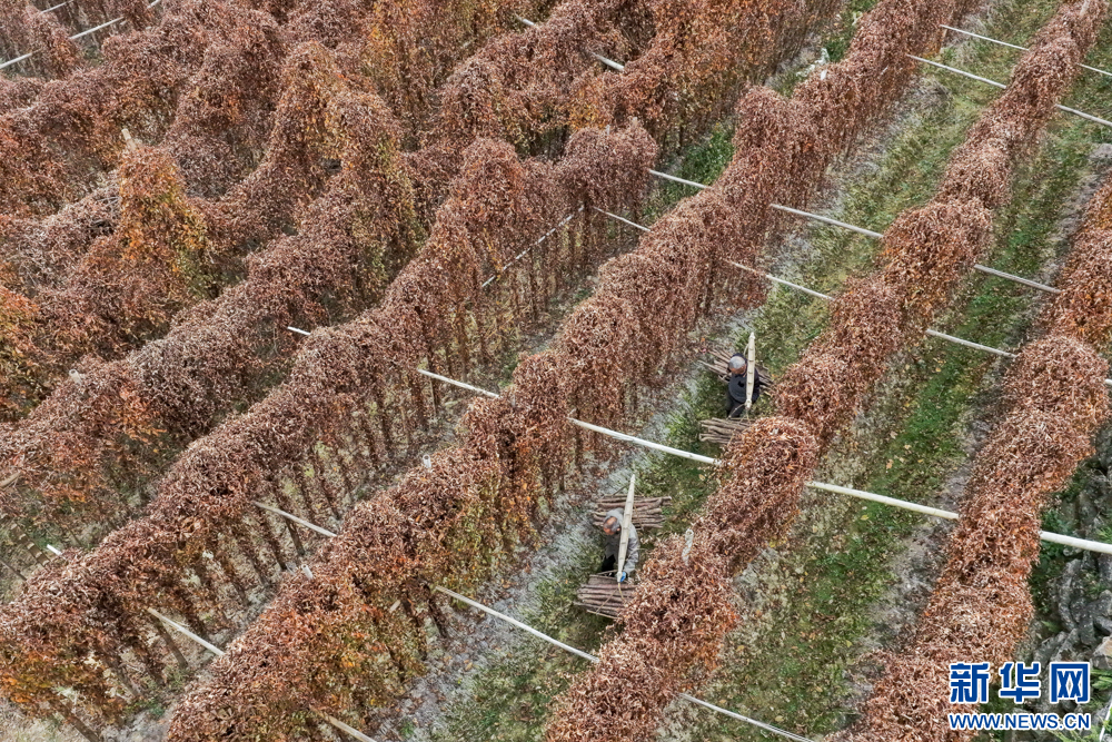 1月5日,农户挑着淮山,从一片淮山园中走过。近期,当地淮山陆续进入集中采收期(无人机照片)。新华网 肖和勇 摄
