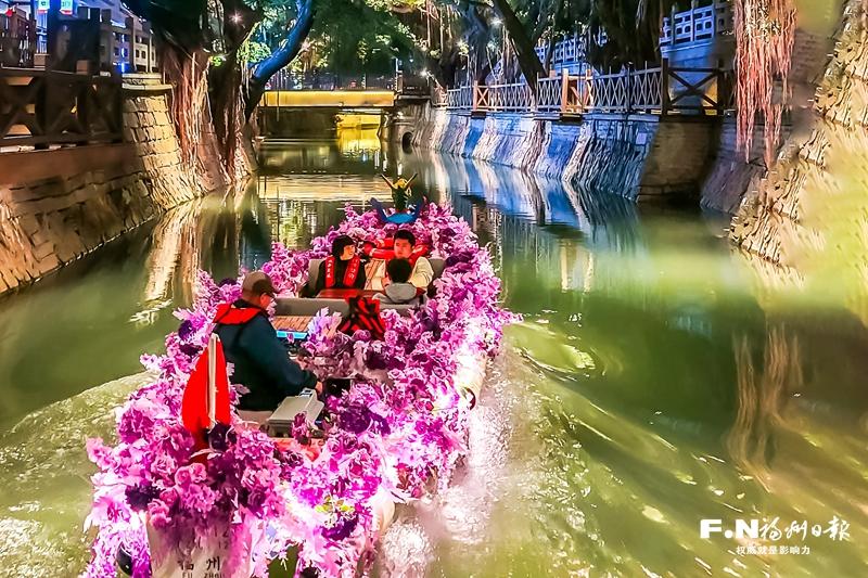 华灯初上,“水上福道”换上了更为神秘浪漫的“星月晚装”,西湖—白马河航线、环西湖航线、晋安河航线等,带领市民游客感受榕城的璀璨风华。