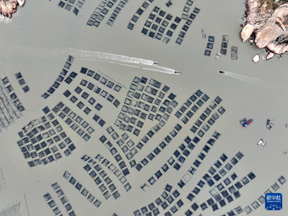 1月23日,船只行驶在福建省宁德市霞浦县下浒镇海上养殖区(无人机照片)。新华社记者 姜克红 摄