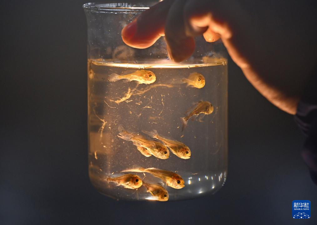 1月22日,在福建省宁德市福鼎市沙埕镇一家大黄鱼育苗企业,技术人员查看鱼苗长势。新华社记者 姜克红 摄