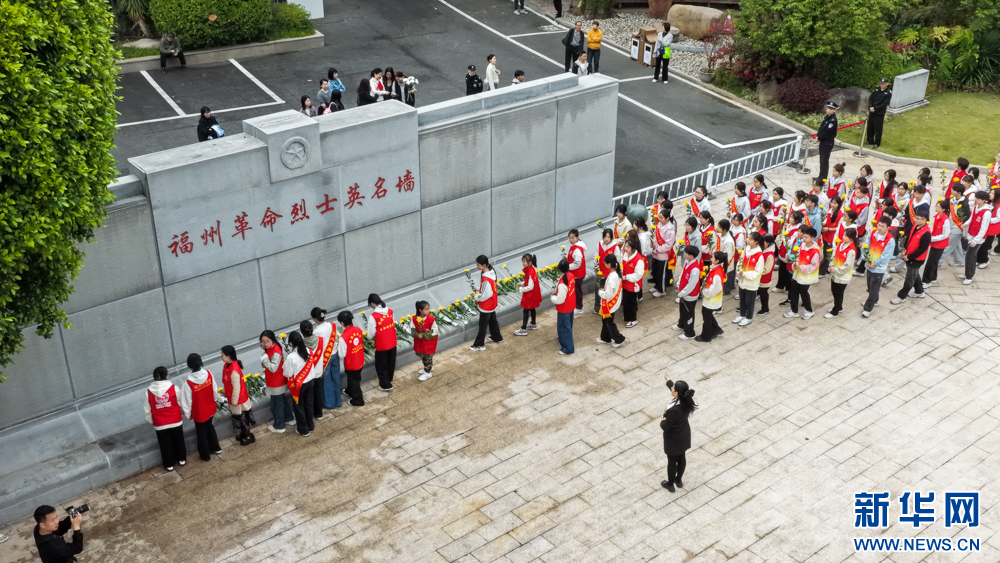 3月29日,学生代表向福州革命烈士英名墙敬献鲜花,缅怀英烈(无人机照片)。新华网 肖和勇 摄