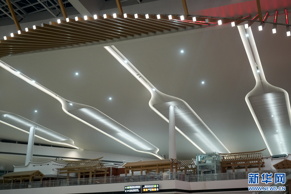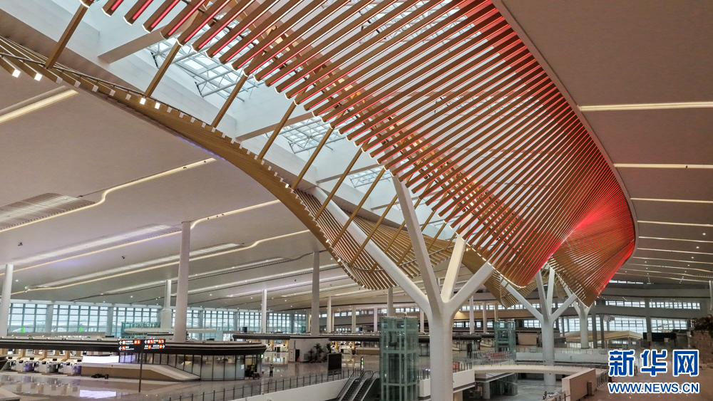 这是T1航站楼出发大厅内看到的天窗,呈现波浪造型,目前已完成灯光调试(3月31日摄,无人机照片)。新华网 肖和勇 摄