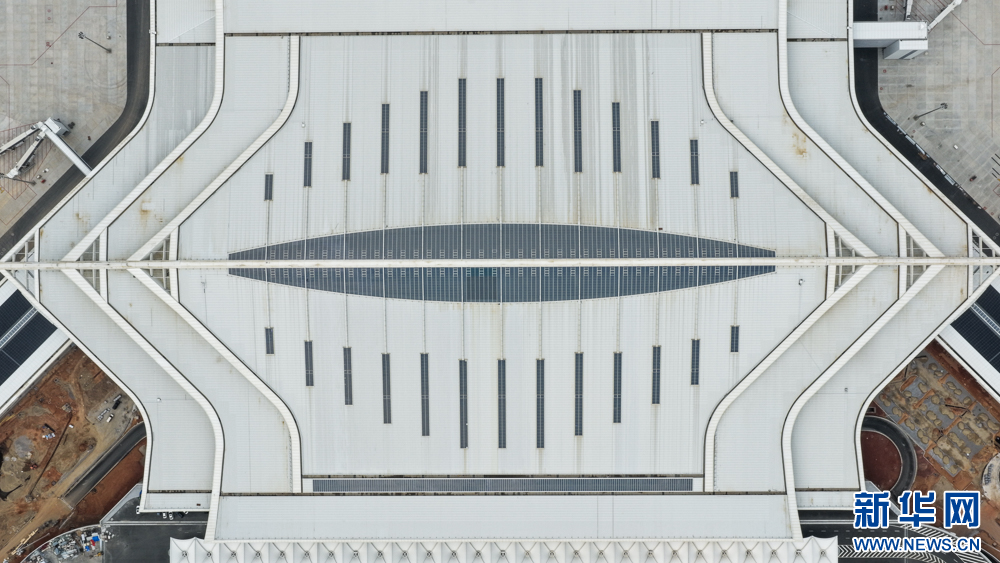 这是机场T1航站楼,天窗呈现龙舟船桨造型,设计灵感来自龙舟文化(3月31日摄,无人机照片)。新华网 肖和勇 摄