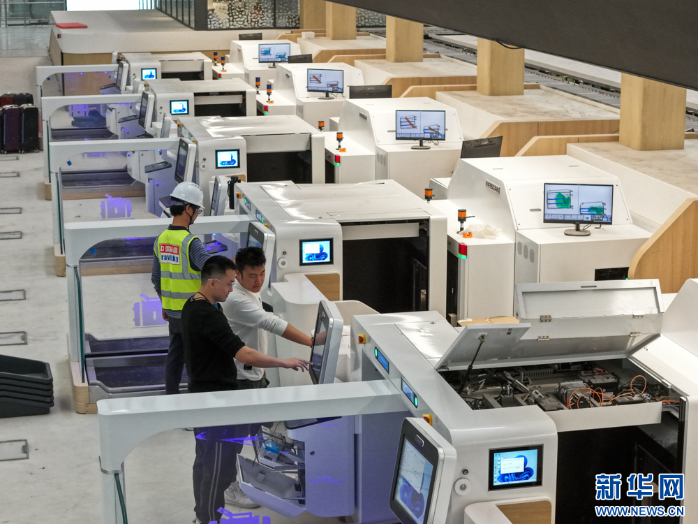 这是T1航站楼出发大厅值机岛,工作人员在调试设备(3月31日摄,无人机照片)。新华网 肖和勇 摄