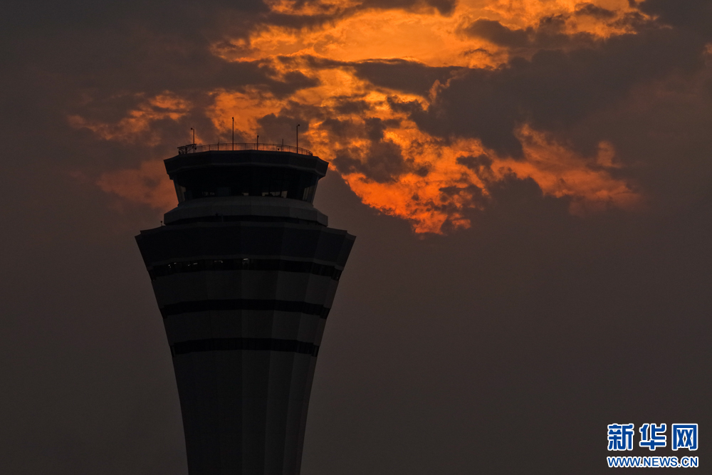 这是3月31日拍摄到的空管塔台与晚霞,形似一把火炬(无人机照片)。新华网 肖和勇 摄