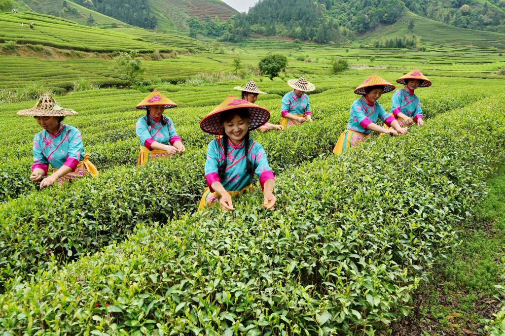 4月15日,在武夷山市星村镇的一处茶园,大家齐喊“采茶喽”。