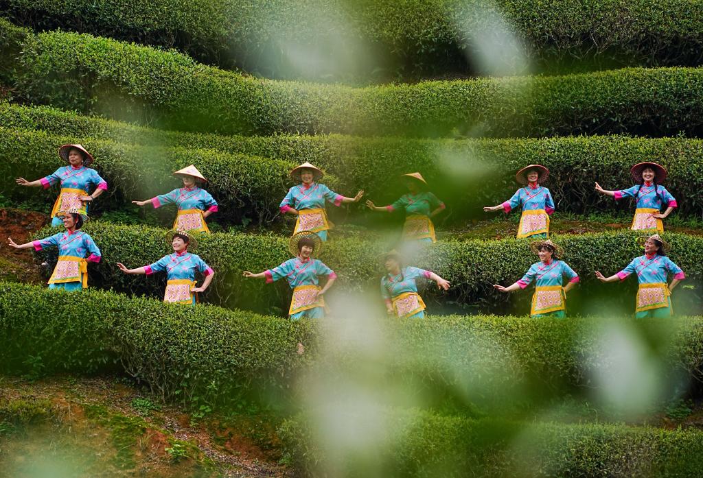 4月15日,茶农和游客在茶山跳茶舞。新华社发(陈颖 摄)