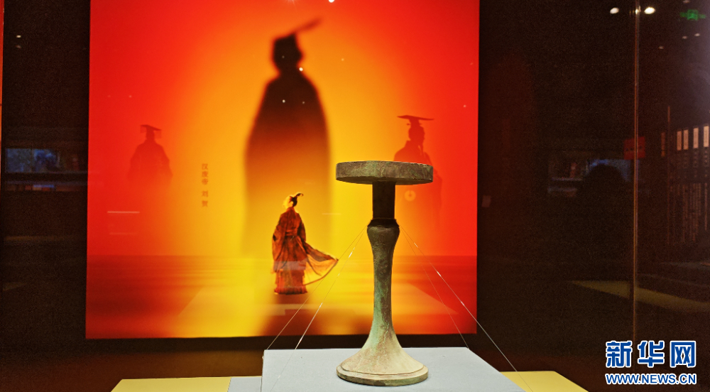 展览展出的“李姬家”铭文青铜豆形灯。考古专家猜测此灯应为刘贺祖母李夫人旧物,后传于子孙,由刘贺携至封地。新华网 刘丰 摄