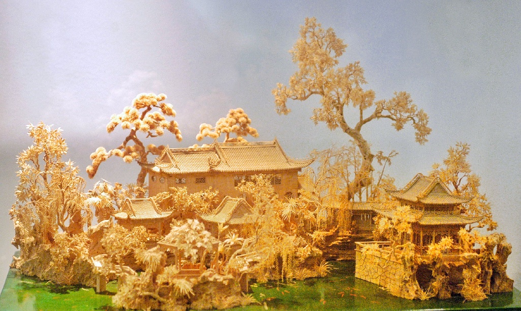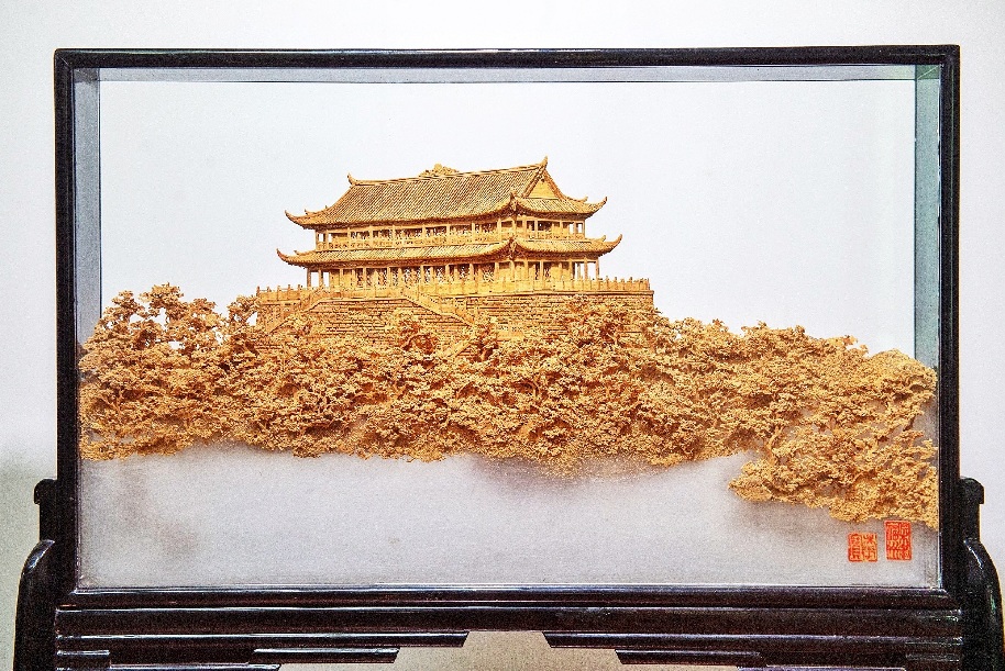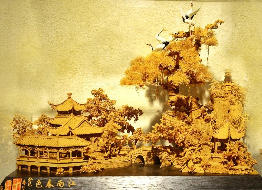 软木画技法虽源于木雕工艺,主材选料、制作工具、生产流程与艺术效果却截然不同。软木画技法内涵是追求“工艺画艺术”,其制作工艺所汲取的写生、透视、古代建筑、山水园林等中国传统文化更是长期审美与文化积累的体现。运刀如运笔,美景刀下出。将软木画制作工具刻刀比作绘画的画笔虽是比喻说法,却形象道出了软木画技法的突出特征。