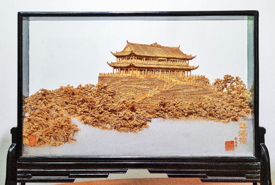 吴学宝创新的双面半立体软木画作品《镇海楼》(正面)。张旭阳/摄
