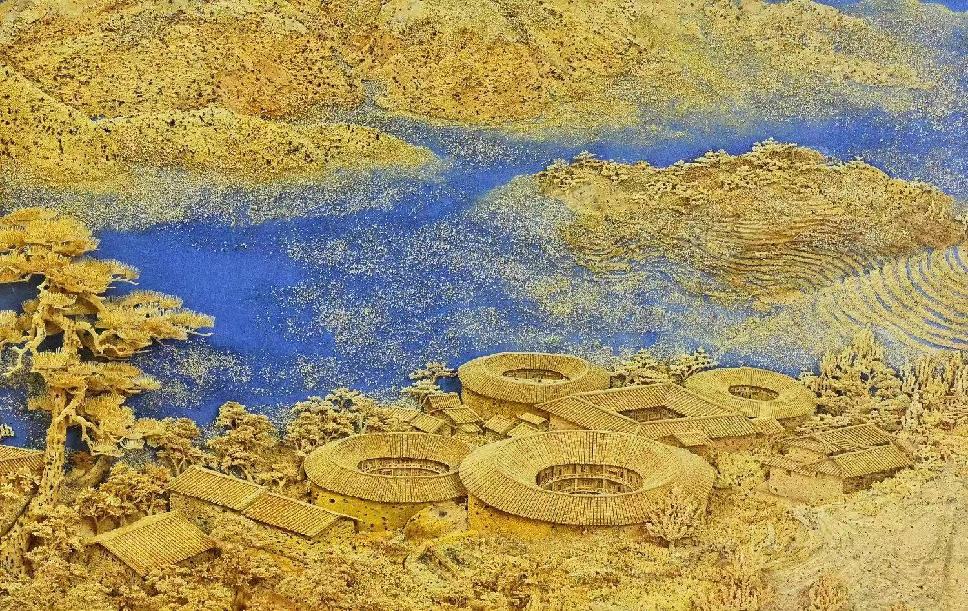 上世纪90年代初期,吴学宝带领众工匠为人民大会堂福建厅创作作品《土楼奇观》。土楼群建筑采用高浮雕技法雕镂,并运用俯瞰式散点透视布局的技法,把群山峻岭和土楼错落有致地浓缩在挂框中。在构图上凸显土楼,然后根据近大远小的透视原理,把近景、中景、远景巧妙地结合起来,以精雕细镂的工艺展现土楼独特壮观的场景。