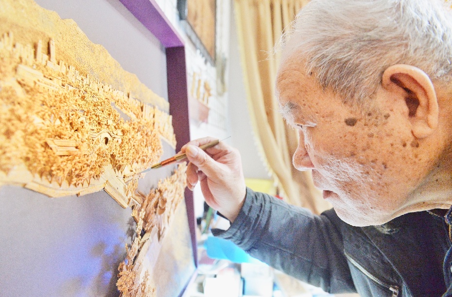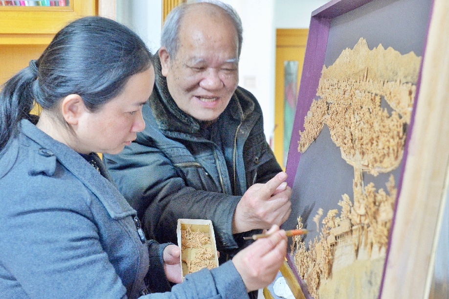 如今83岁的吴学宝,仍旧是刀耕不辍,每天坚持与软木片们“对话”:除了吃饭、睡觉,就是画图稿、刻部件、搞创新,有时半夜两三点有了灵感,也会爬起来开工创作。虽然他的儿女均未传承软木画技艺,但令吴学宝宽慰的是,随着各级政府对软木画保护传承工作的重视,以及社会各界积极参与拯救、复兴软木画技艺,逐渐有年轻人介入软木画生产制作中来,软木画的薪火相传也有了接班人,技法、风格也得以延续……