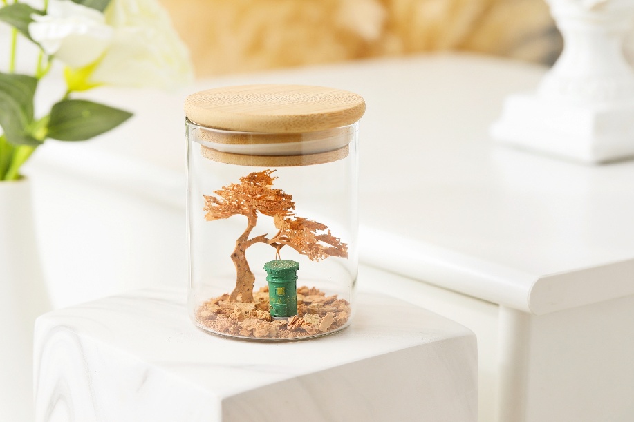 新型软木画玻璃瓶作品《邮筒》,全新的配景制作完全不同于传统软木画。工美心音艺术/供图
