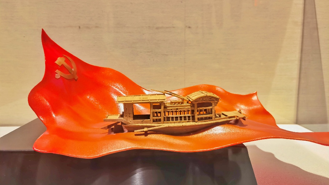 围绕“建党一百周年”主题,以红船、党旗、南湖水三元素为创作内容的作品《红魂》,作者:胡丽娟、胡文平、林世冰。林晗/摄