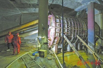 17日,水流湍急的洪山桥段,一艘500吨位的江面随行大型施工保障船安静停泊。“江底盾构走到哪里,它就跟到哪里,这在国内尚属首次。”上海隧道工程有限公司福州地铁4号线1标盾构经理樊俊松说,2021年4月11日地铁盾构始发,至今年1月11日洞通,4号线一期左线耗时640天,其中450天用于攻克仅长450米的穿江路。