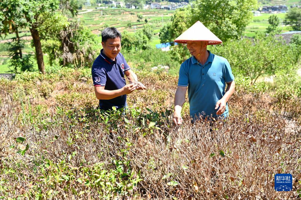 8月25日,宁德市霞浦县牙城镇枣岭村党支部书记雷大明(左)向茶农黄鸿锡了解茶叶高温干旱受损情况。新华社记者林善传摄