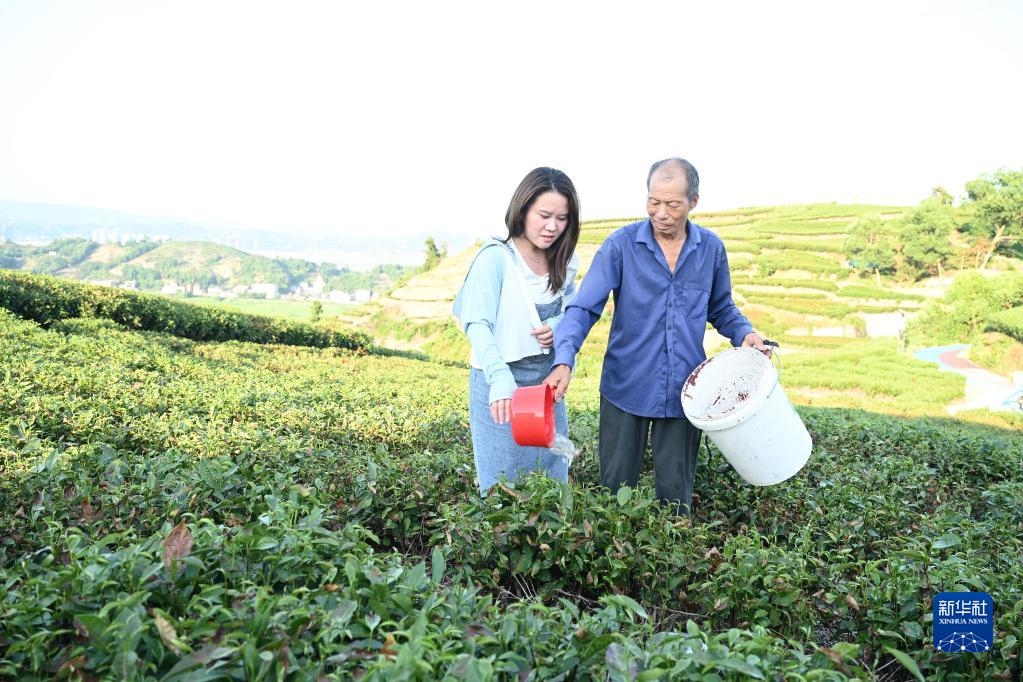 8月25日,植保技术服务人员林玲靓(左)在福鼎市点头镇江美村一处茶园指导茶农利用天然源生物激活剂等开展茶树旱热害修复处理。新华社记者林善传摄