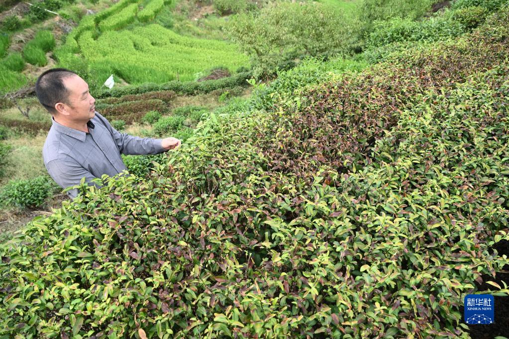 8月24日,宁德市蕉城区九都镇九仙村村民陈松祖在介绍茶树干旱受损情况。新华社记者林善传摄