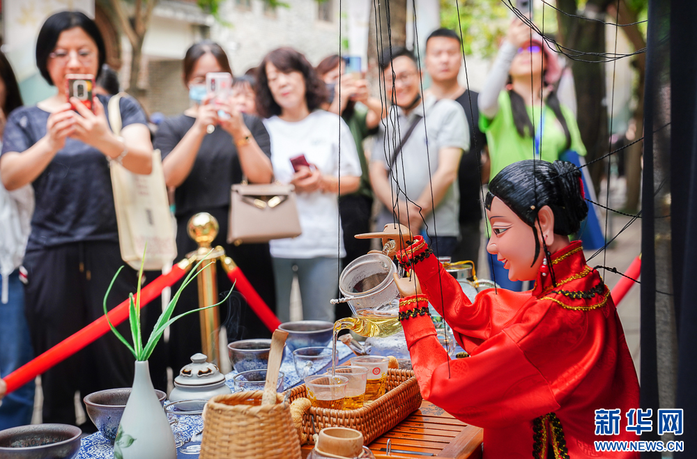 5月21日,福州市上下杭历史文化街区,演员在表演木偶茶艺,吸引游客观看。新华网 肖和勇 摄