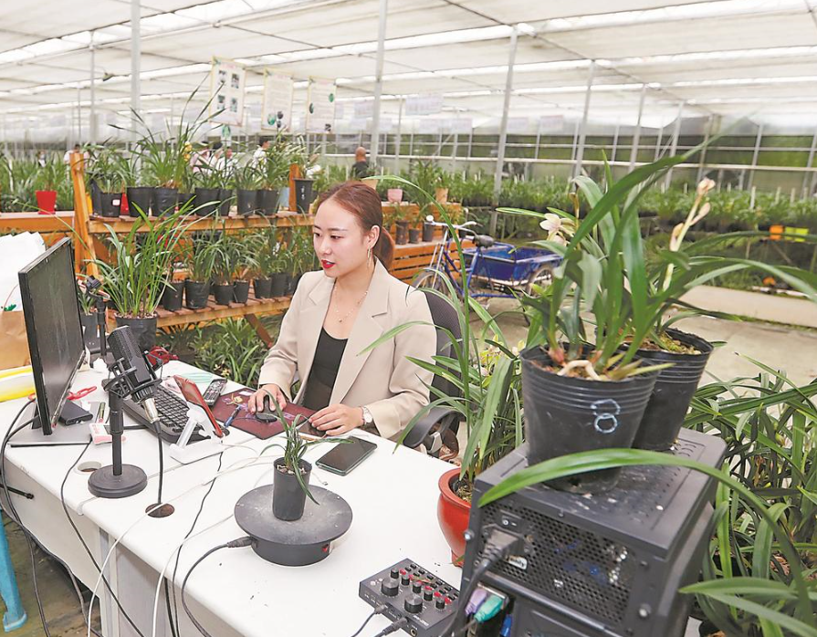 “这盆100元起拍,加价20元,3分钟计时开始……”在位于朋东村的宏源花卉有限公司兰花圃,主播们把直播间“搬”进大棚,开辟了一条从带货、打包到物流的流水线。不一会儿,屏幕左上角的观看数量已逾2万人次。