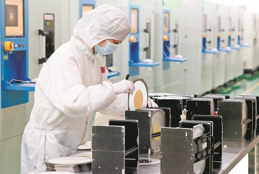 日前,在福州高新技术产业开发区一家芯片生产企业内,工人在生产线上赶制订单。