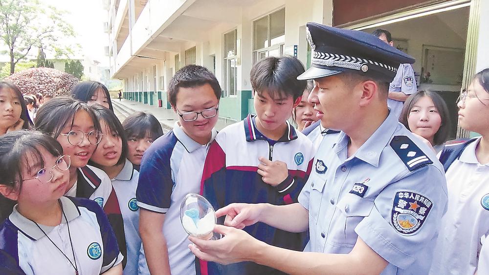 近日,顺昌县禁毒大队、元坑派出所走进元坑中学开展禁毒宣传进校园活动,通过讲解宣传单页、展示新型毒品仿真模具等形式,让同学们全面了解毒品危害,增强学生防毒、拒毒的意识。图为民警向学生宣传禁毒知识。(张雯 摄)