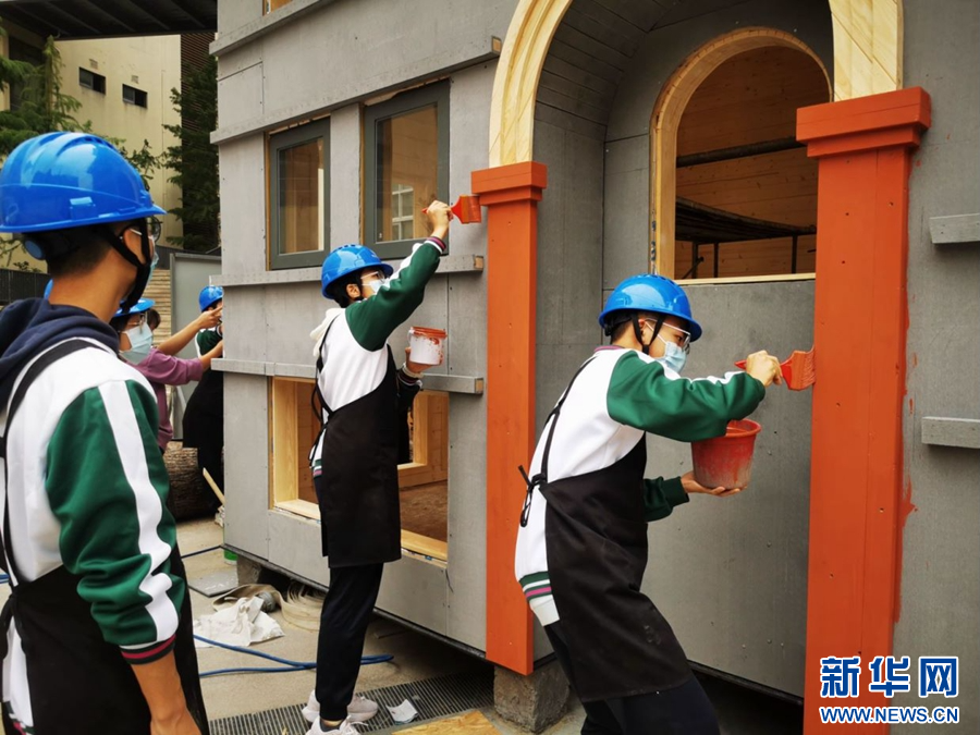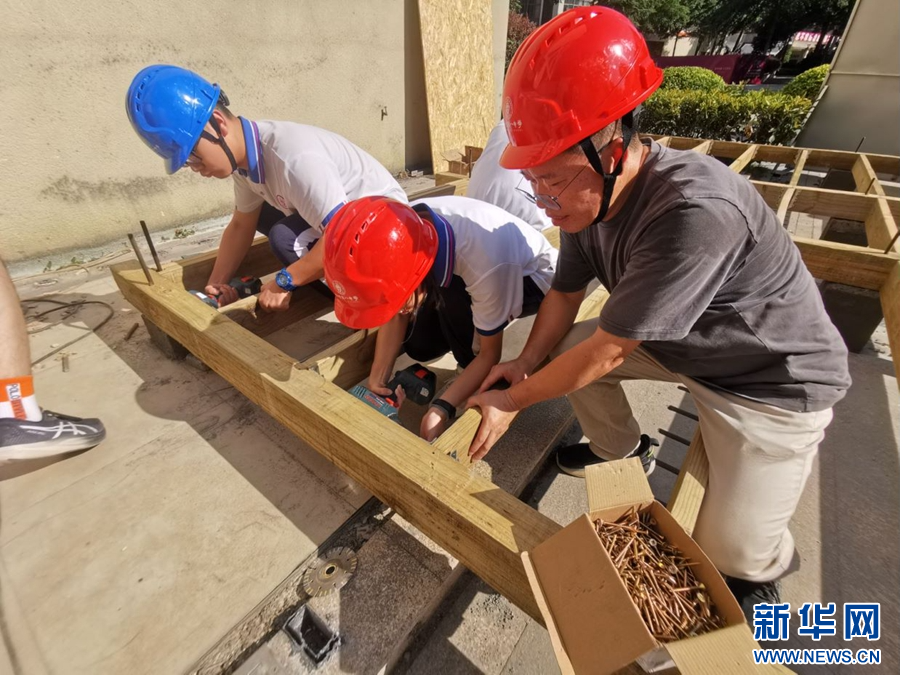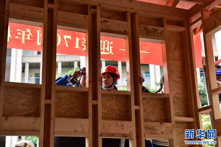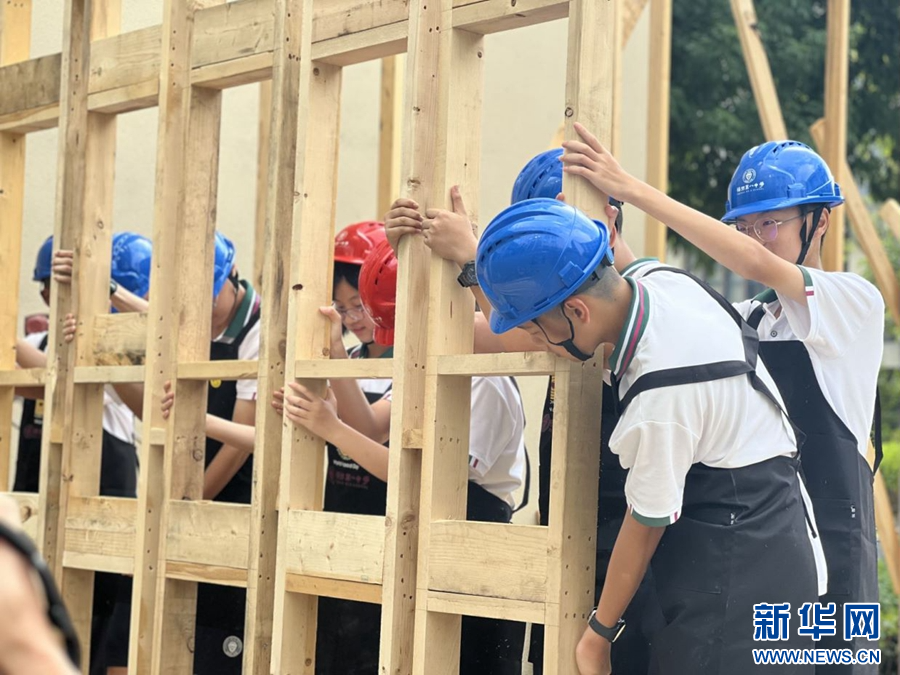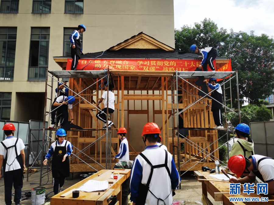 福州八中学生在通用技术课教师章盛智的指导下建造小木屋。新华网发(福州八中供图)