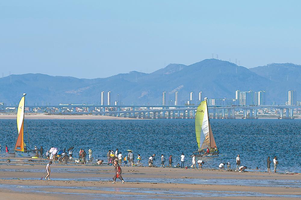 游客在后田海滩上玩耍,对岸的厦门岛上一架航班正在起飞。