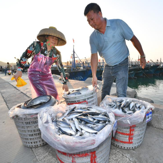 近日,澳角村村民在渔港码头上搬运海产品。新华社记者 姜克红 摄