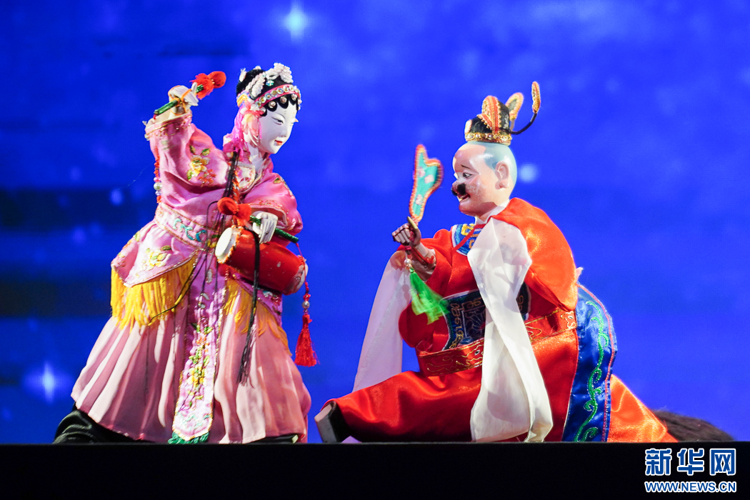 这是互动节目《指掌乾坤》,漳州市布袋木偶戏传承保护中心演员在演示花旦舞彩绸场景。新华网 肖和勇 摄