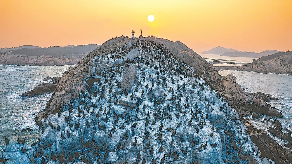 2024年12月28日傍晚,大批鸬鹚栖息在连江县东洛岛。越冬鸬鹚的排泄物经过长年风化,将峭壁染成了白色。 丁天霖 摄