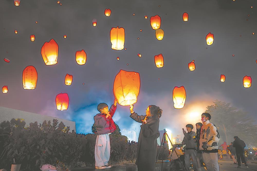 2024年12月31日晚上,福州市连江县人民广场,市民放飞孔明灯,迎接2025年的到来。丁天霖 摄