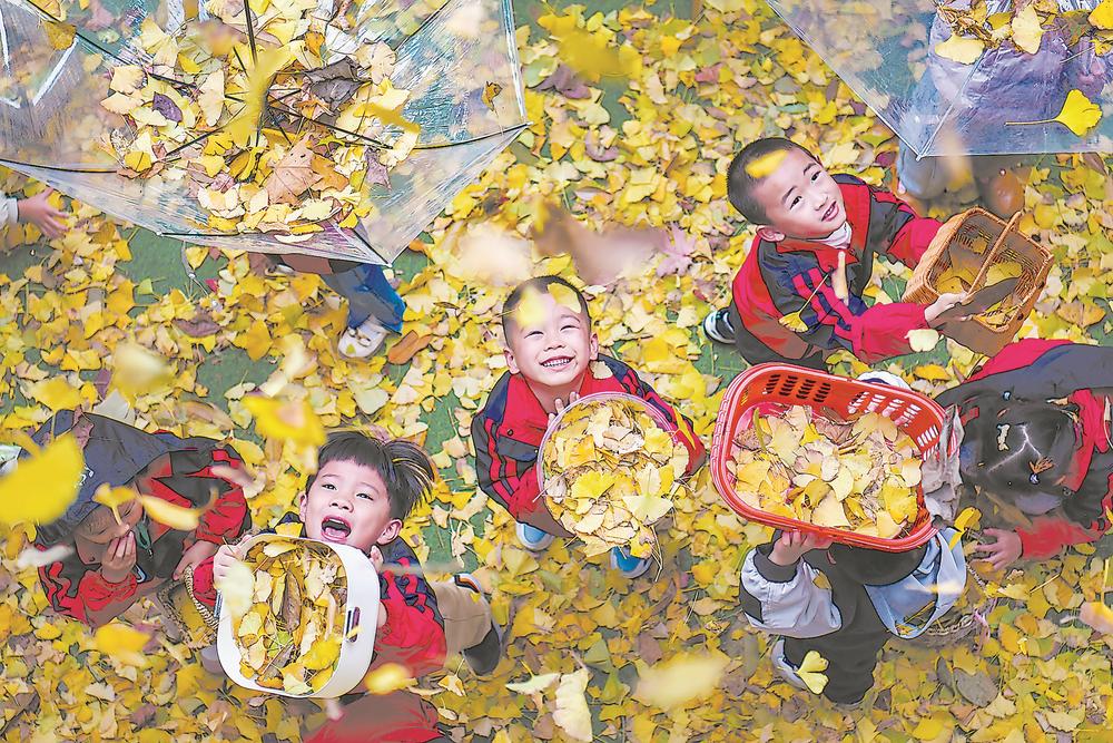 2024年12月4日,德化县城关幼儿园的小朋友,用各类工具接住空中飘下的落叶。 许华森 摄