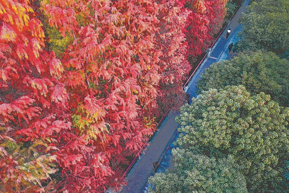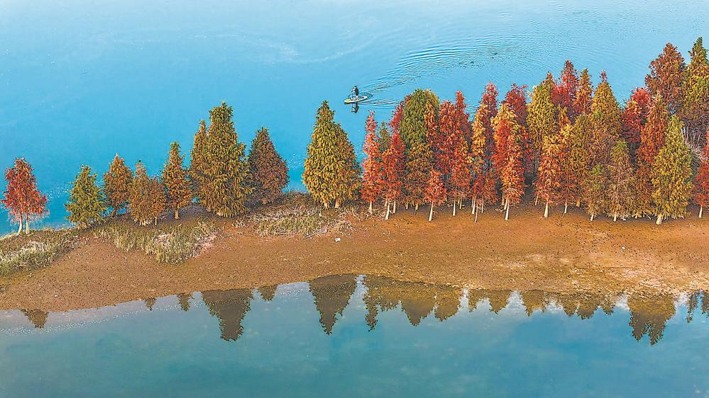 1月8日,福州闽侯,一名桨板爱好者在闽江中观赏红色水杉林。林熙 摄