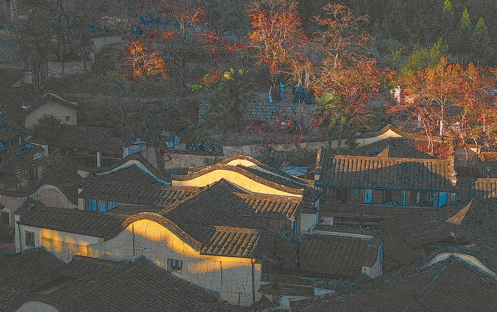 与北方的“出门尽寒山”不同,闽地山水在冬日皆可入画:柿子红、银杏黄、霜雪白、石瓦黑、远山黛……