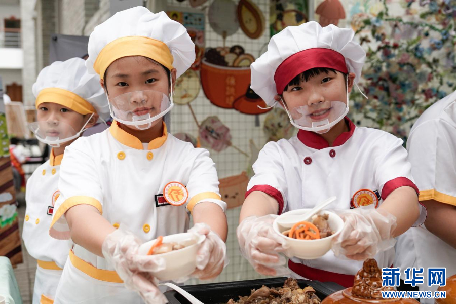 两位小学生现场制作并展示福州传统名菜佛跳墙。新华网 蒋巧玲 摄