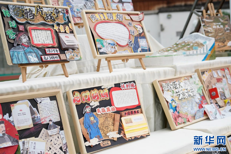 学生们制作的林则徐虎门销烟手抄报作品。新华网 蒋巧玲 摄