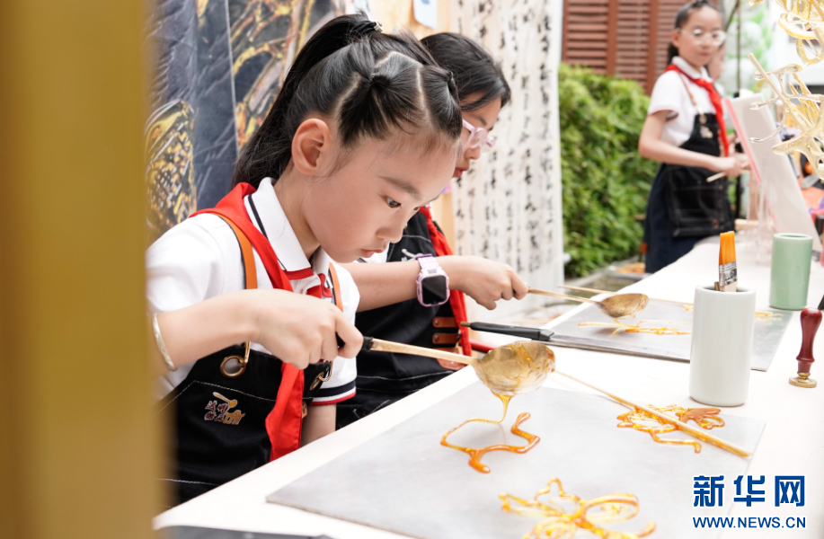 两位小学生在糖画制作过程中,感受“甜蜜乐趣”。新华网 蒋巧玲 摄
