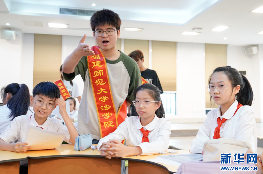 福建师范大学法学院的大学生们走进福州市林则徐小学,为小学生们讲解反对校园霸凌的典型案例。新华网 蒋巧玲 摄