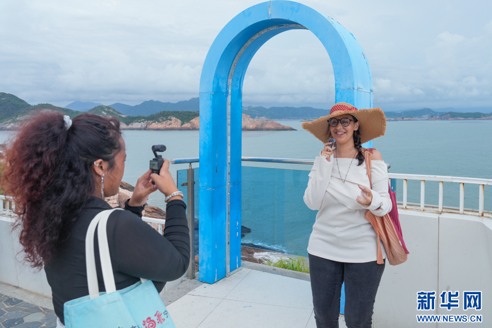 9月20日,两名外国游客在霞浦县“东海一号”风景观光道海尾观景台拍摄Vlog。新华网 肖和勇 摄