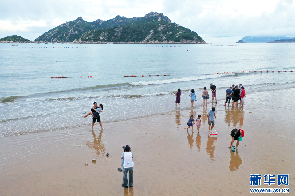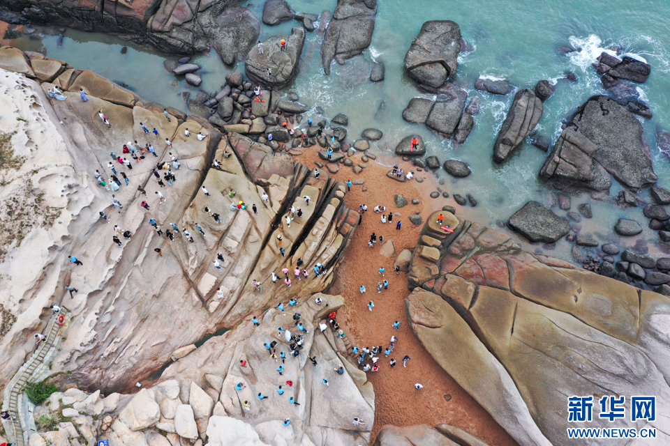 9月20日,游客在霞浦县“东海一号”风景观光道大京沙滩景区游玩(无人机照片)。新华网 肖和勇 摄