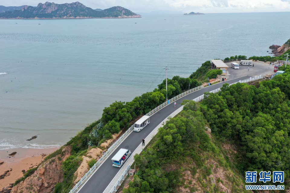 9月20日,霞浦县“东海一号”风景观光道下尾岛景点,游客乘坐电瓶车游览观光(无人机照片)。新华网 肖和勇 摄