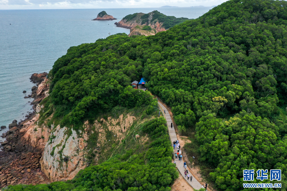 9月20日,霞浦县“东海一号”风景观光道下尾岛景点,游客在绿道上漫步观光(无人机照片)。新华网 肖和勇 摄