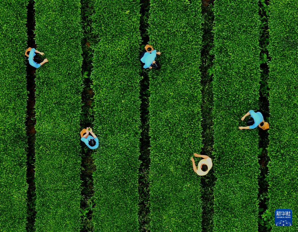 在安溪县西坪镇珠洋村八马红星茶场,茶农在茶园里采收茶叶(2024年5月9日摄,无人机照片)。新华社记者 魏培全 摄
