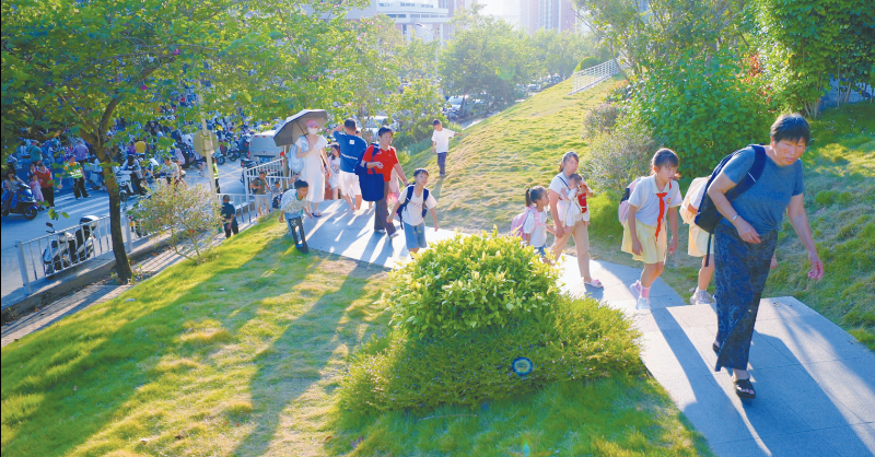 “接孩子再也不用在路边干等了,公园里能散步、有地方坐,还能和其他家长聊聊天。”傍晚时分,公园里聚集了不少等候孩子的家长。退休的王阿姨笑着说:“有了亲子活动区、健康步道,接送孩子、加强锻炼两不误,这才是老少皆宜的好设计。”