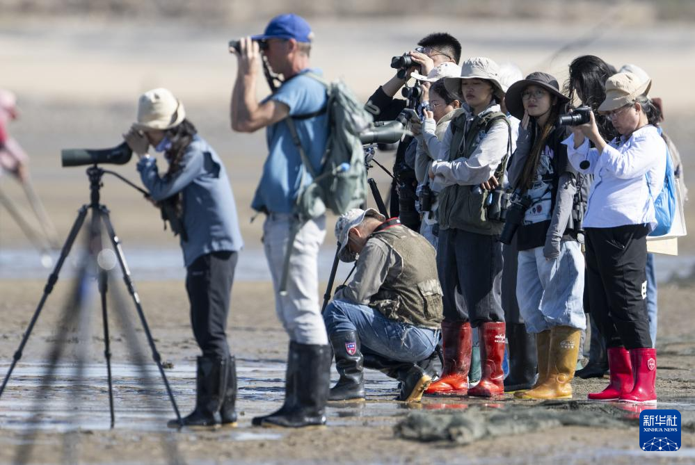 11月9日,中外观鸟爱好者在泉州围头湾滩涂上观测勺嘴鹬。新华社记者 魏培全 摄