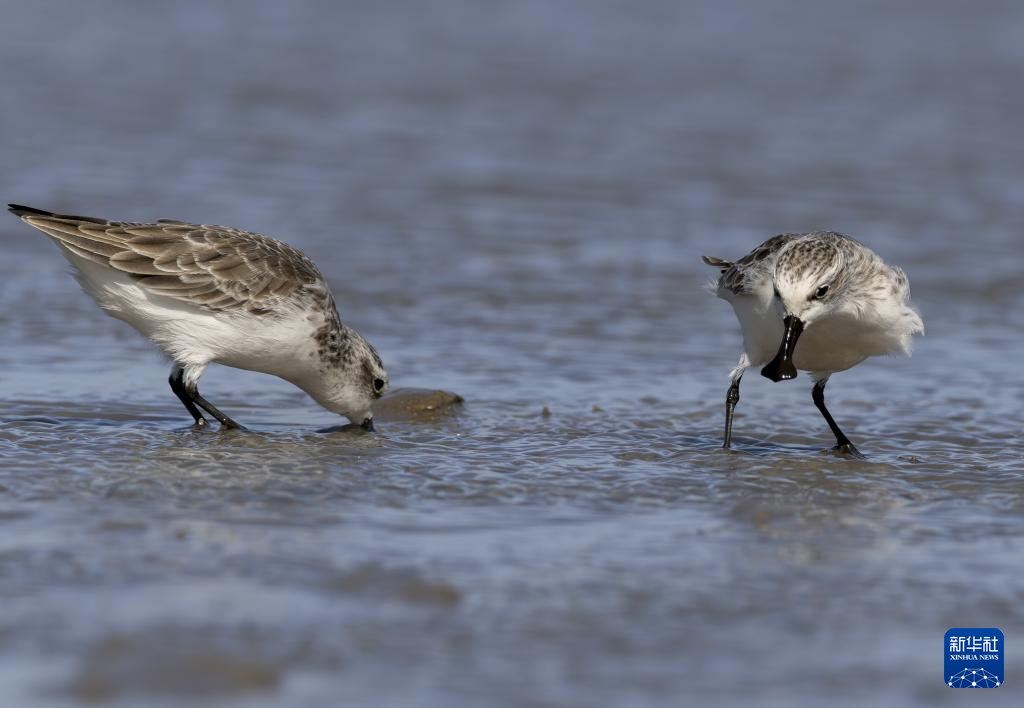 11月9日,两只勺嘴鹬在泉州围头湾滩涂上觅食。新华社记者 魏培全 摄