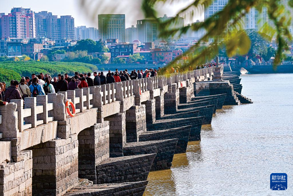 游人在泉州洛阳桥上游览(3月18日摄)。新华社记者 姜克红 摄